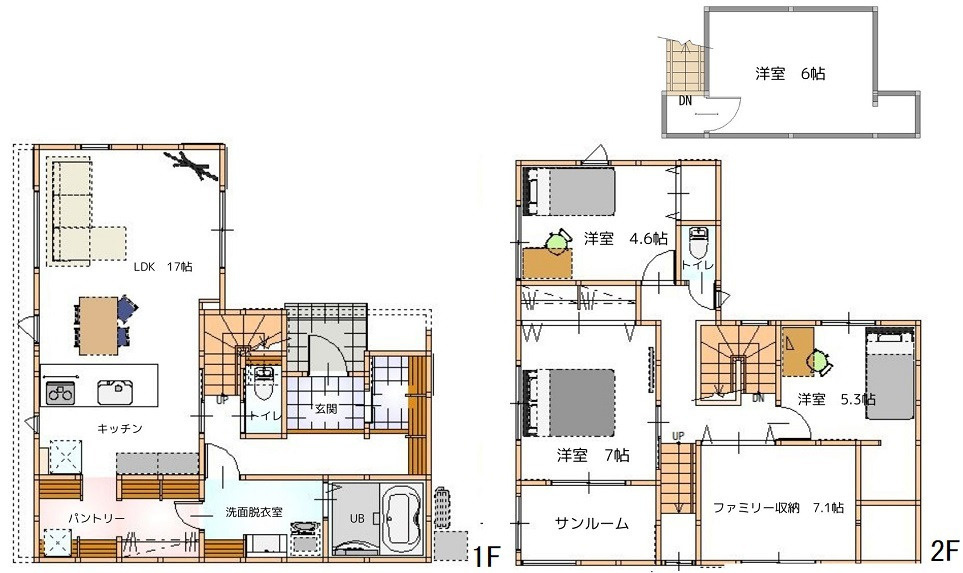1F18.5LDK パントリー ランドリールーム 2F 8洋 6.2洋 6洋 6ファミリー収納 トイレ 6洋(スキップルーム) - 向き