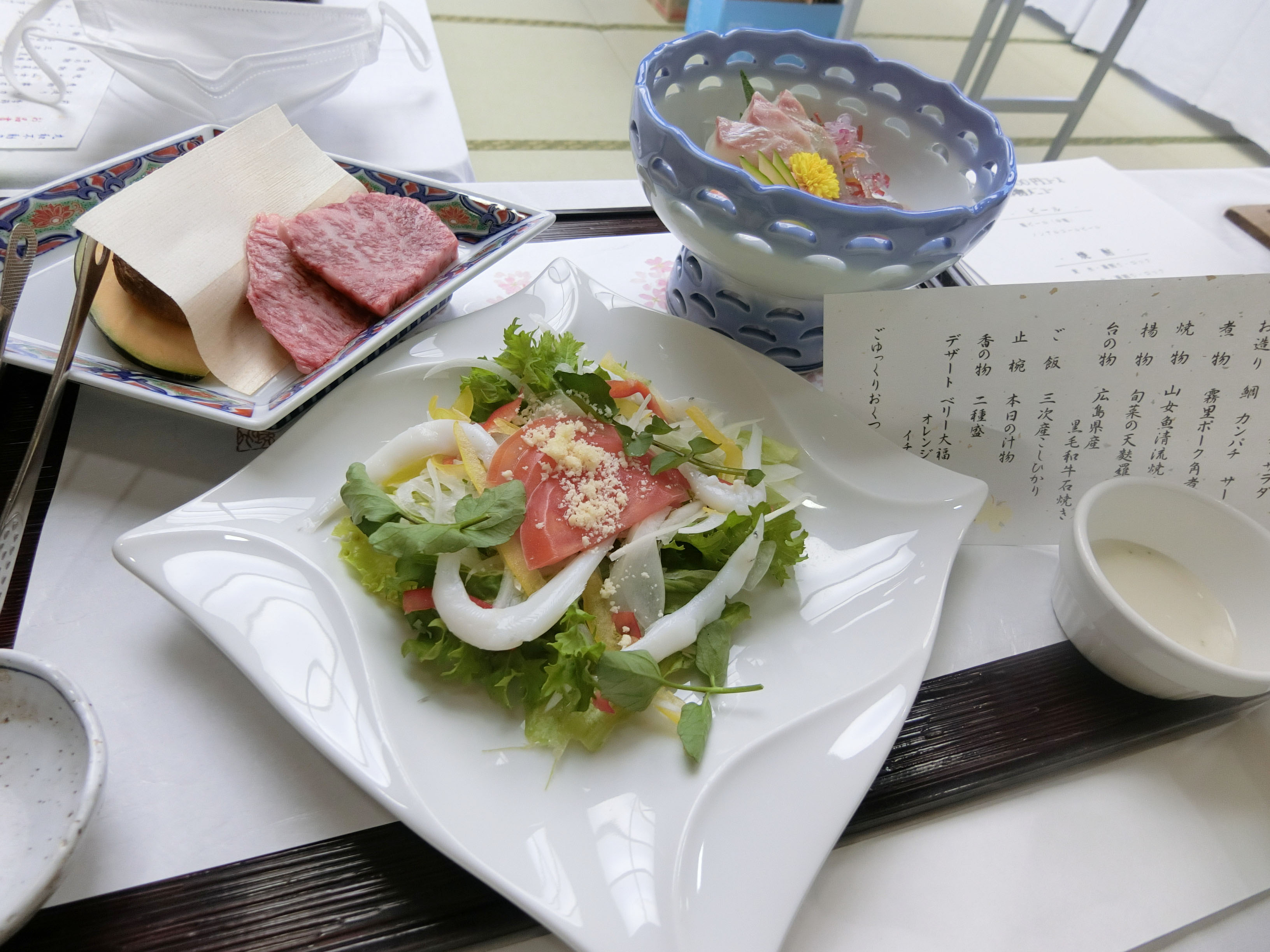お造り、山女魚、広島黒毛和牛、天ぷら、豚の角煮等々