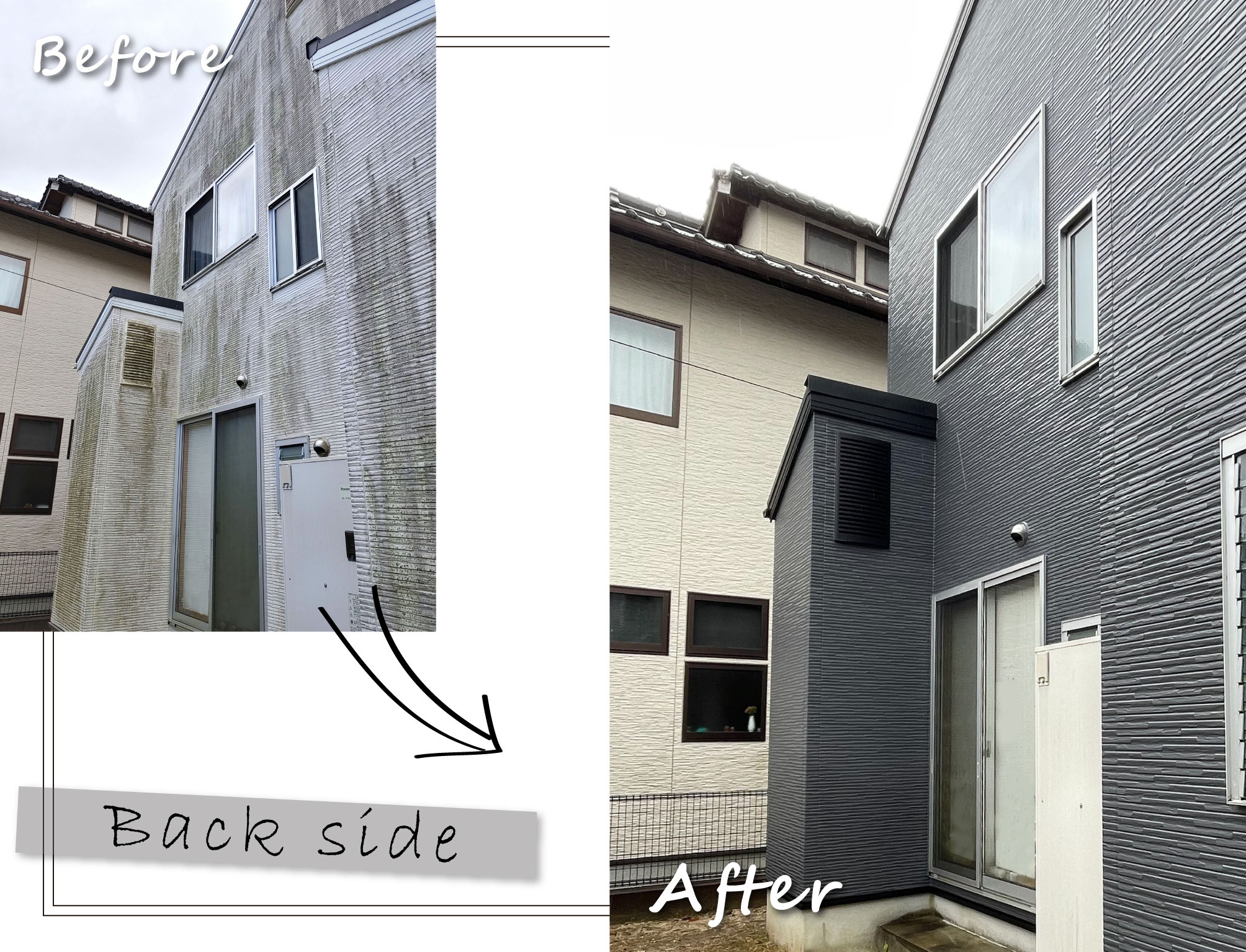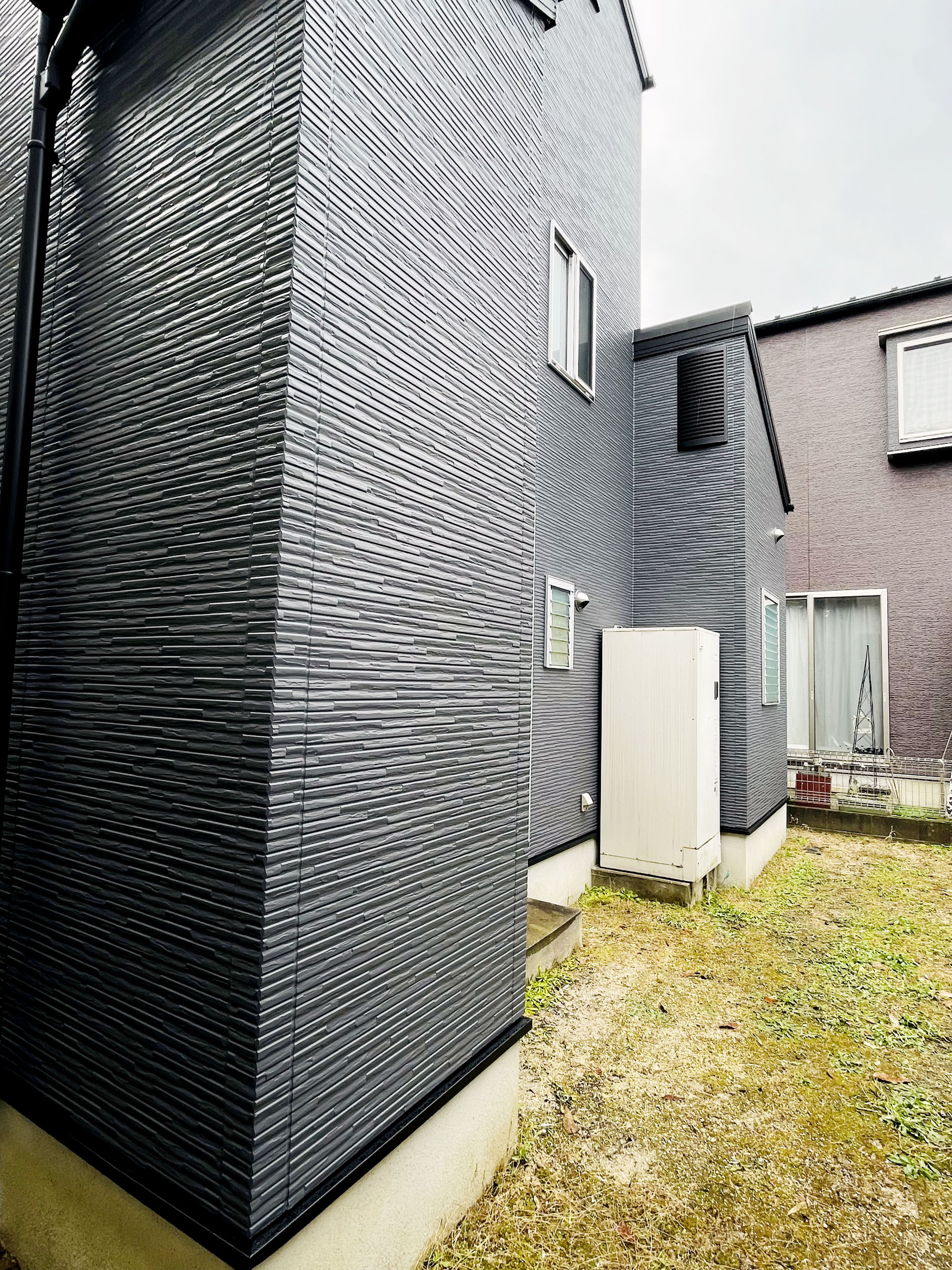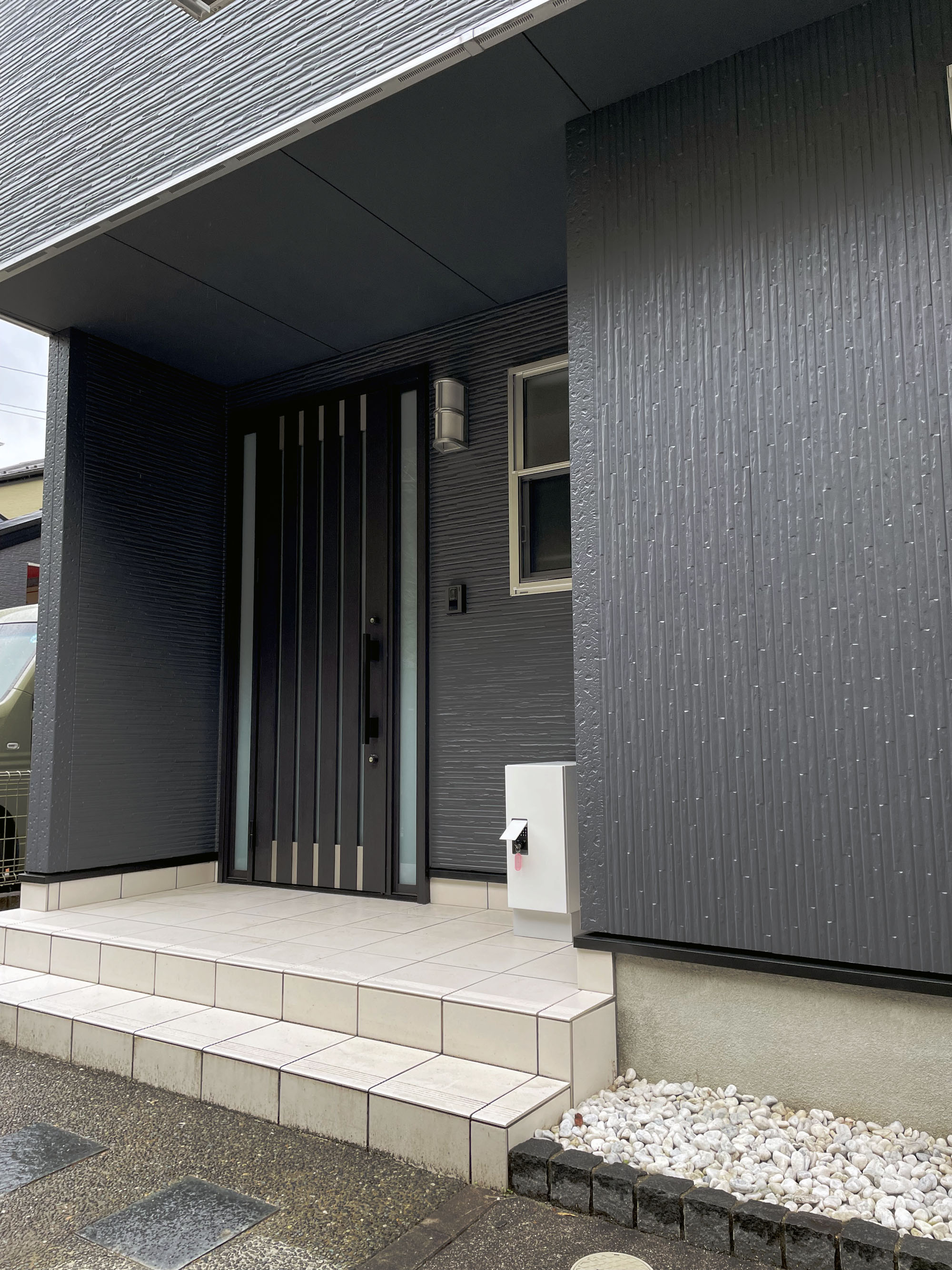 担当より他社でも見積を取られた中で、弊社が一番安かったとの事(*’▽’)築10年O様邸 白を基調とした素敵なお家ですが、 湿気が多い立地のため、どうしてもカビが気になるとの事でした。今回の色のご希望は真っ黒。黒は今流行っていて選択される方が多い色。ただ、太陽光を吸収しやすいため家が熱くなりやすいので、遮熱塗料をおすすめしました。ひとえに黒といってもたくさん種類があります。見本帳の中から色を選ぶのは大変という事で、黒外壁のお家の写真を見ながら好みを教えて頂き、一緒に仕上がりをイメージしながら色選びをして頂きました。今までとは違った印象の外観になり、お客様に喜んで頂けて大変嬉しく思います。