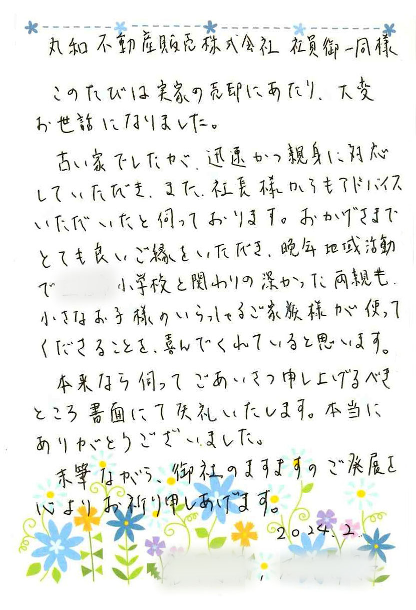 先日、ご実家を売却して頂いたお客様より、お菓子と手書きのメッセージを頂きました!