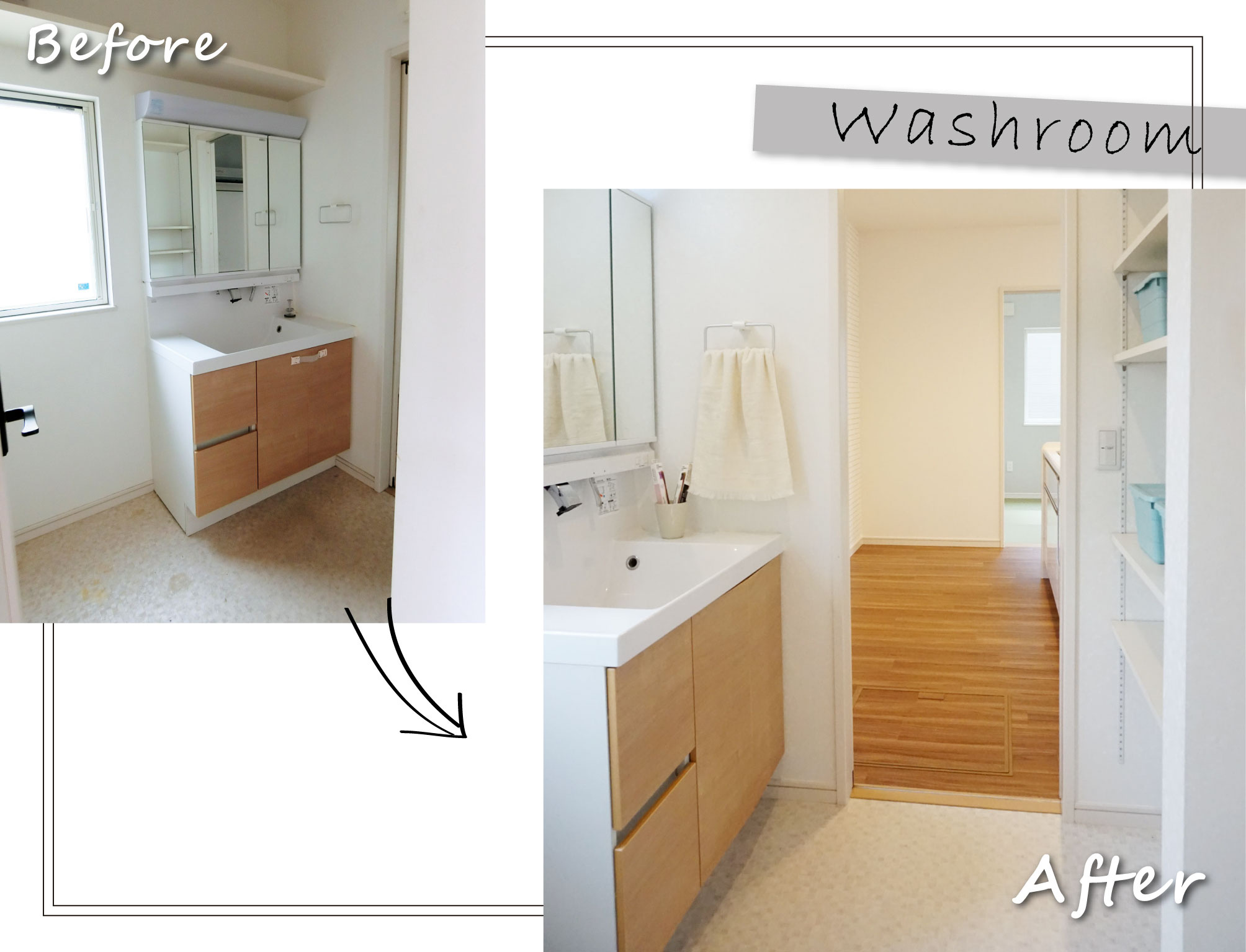 洗面所の床も汚れが目立っていましたので、クッションフロアを貼り替えています。
