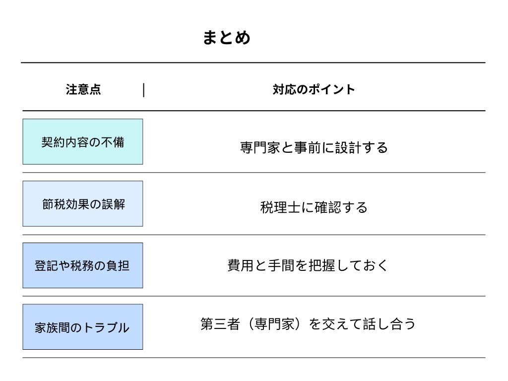 相続税や贈与税の対策をしたい場合は、税理士などの専門家と連携して進める必要があります。